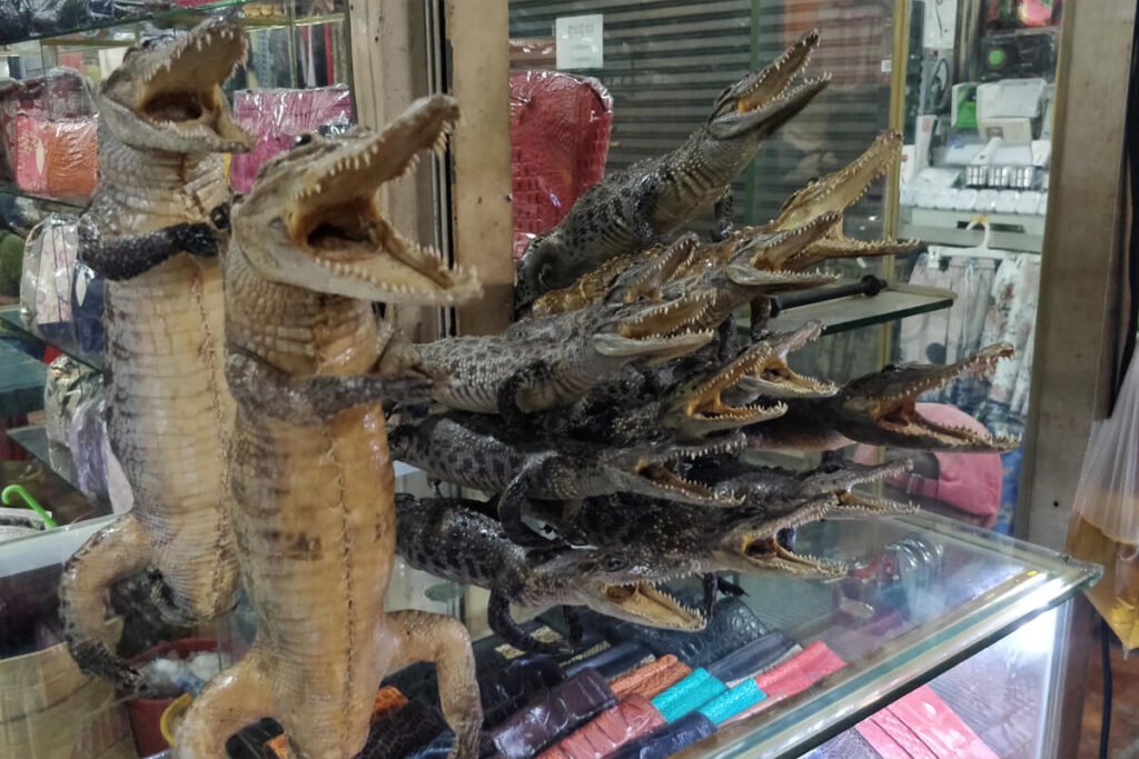 Compro uno zainetto arancione ovviamente tarocco della The North Face per 12 dollari (in Cambogia si può pagare sia con i dollari americani che con i Riel, che non valgono una minchia). Mi faccio un giro per i vari corridoi di frutta e verdura fino ad arrivare alla parte dove vendono tassidermie (animali morti impagliati e roba simile) che è la parte che normalmente mi interessa di più. La mia attenzione viene attirata da dei coccodrilli impagliati di piccole dimensioni. Alcuni di questi disgraziati sono in pose che li fanno sembrare dei deficienti, tipo in piedi, che applaudono o che ballano. Poveri coccodrilli!