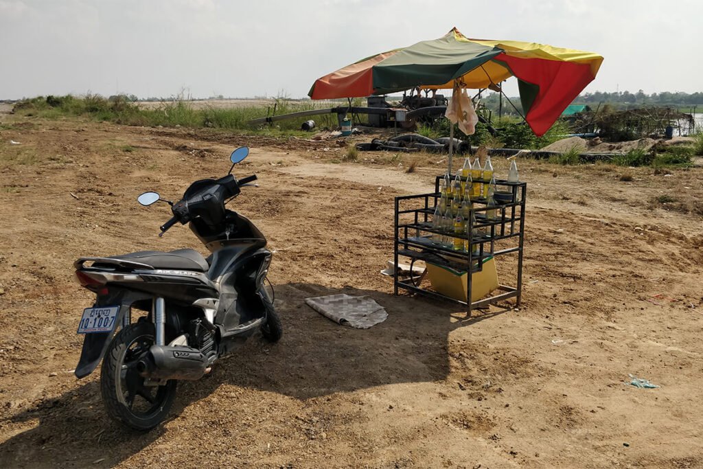 Infatti, nel giro di un quarto d’ora, mi accorgo che il serbatoio è vuoto. Ma non avevo fatto il pieno? Qui, al posto delle classiche pompe di benzina, ci sono semplici bancarelle improvvisate: ombrelloni sotto cui spuntano scaffalature di ferro saldato, sulle quali sono allineate bottiglie di Coca-Cola e Fanta… riempite di benzina. Per un dollaro, una bottiglia da 2 litri riempie il mio serbatoio.