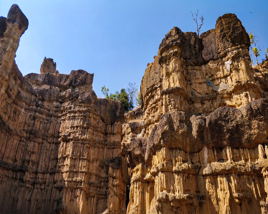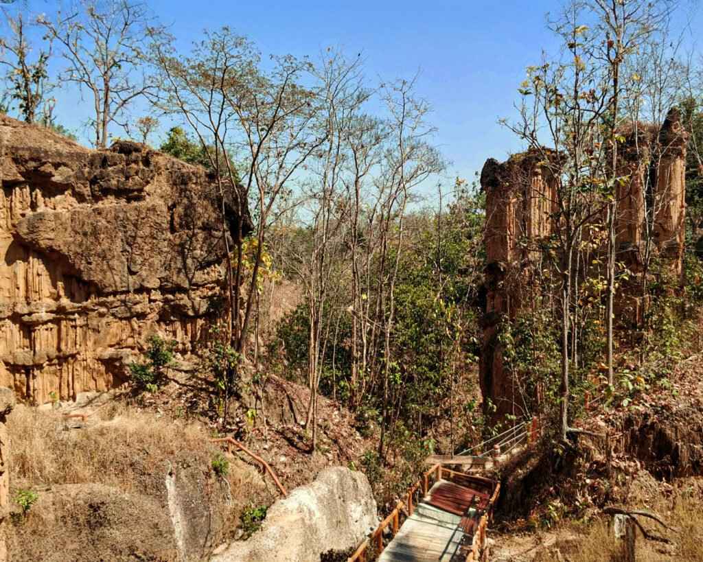 Verso le 2 arrivo finalmente a Pha Chor, sudato come un maiale. E’ l’ora peggiore, credo che ci siano almeno 40 gradi, forse di più. Non c’è nessun riparo dal sole. Mi tolgo la maglietta e la brezza fresca sulla pelle è orgasmica. All’ingresso del parco, c’è un capannone in cima alla collina, da dove si gode una vista spettacolare sulla foresta che si estende all’orizzonte. Compro il biglietto e scendo verso il canyon, una camminata di mezz’ora. Non c’è molta gente, probabilmente a causa del caldo opprimente.