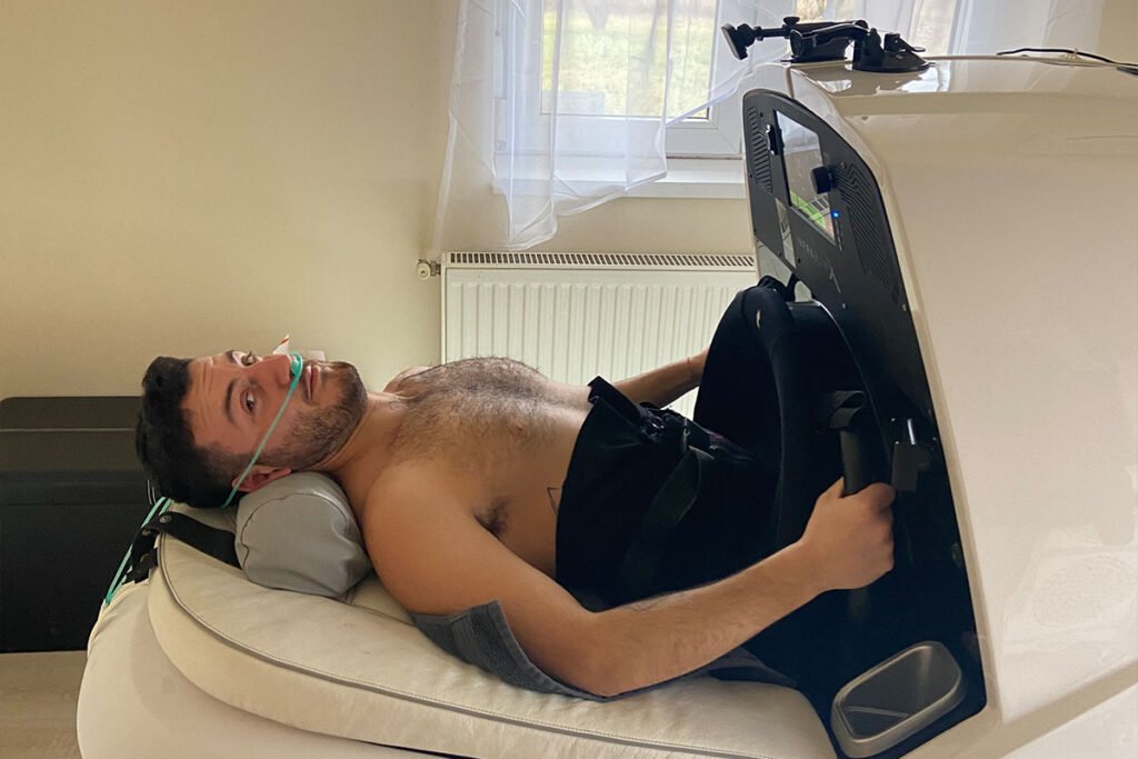 Ed ecco come lei mi spiega l’uso del macchinario: “La vedi la porta? Si apre, tu ti ci metti dentro, però devi essere o nudo o in mutande. Dopodiché ti allaccio una cintura, chiudo la porta, le gambe rimangono bloccate dentro, lasciando il petto e le braccia fuori, mentre rimani semi sdraiato. Poi questo tubo va messo nel naso e tu devi respirare da qua, perché esce l’ossigeno. Poi, una volta intubato, le gambe, che sono dentro, vanno su questi pedali e devi iniziare a pedalare. Al suo interno l’apparecchio si riscalda come se fosse una specie di sauna e poi l’aria viene risucchiata.” Poi fa una pausa e mi fa: “Allora, vuoi provare?”